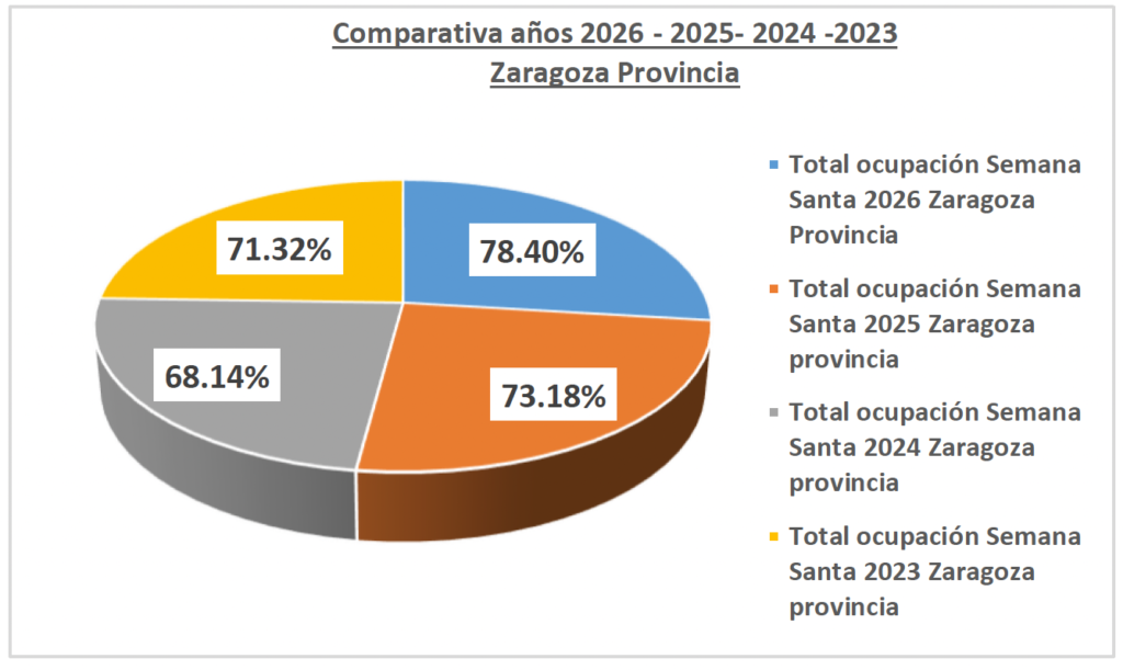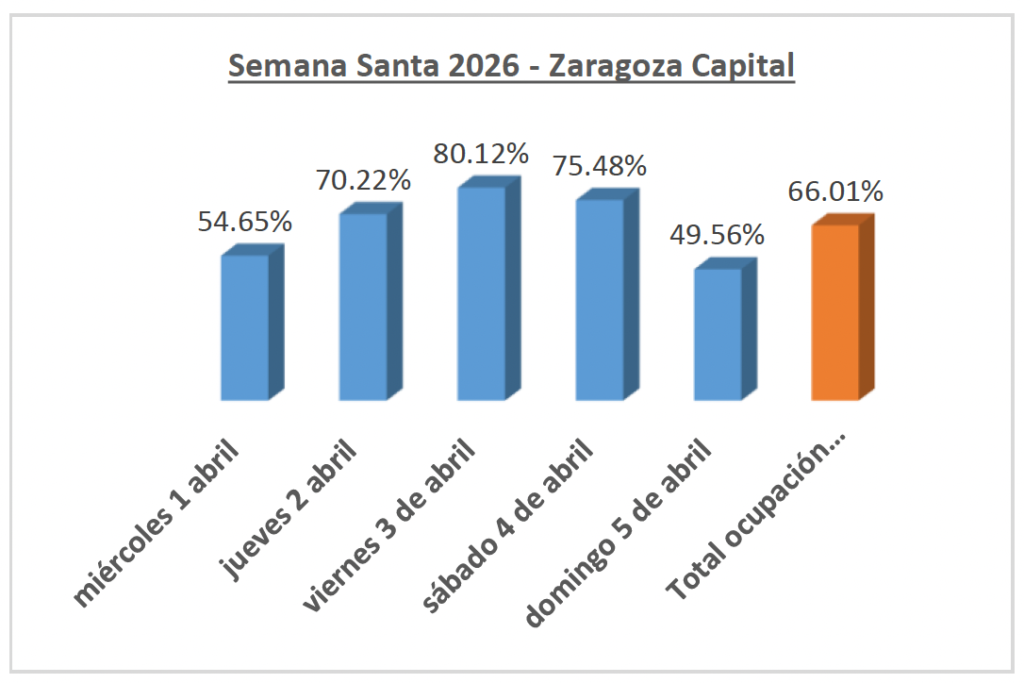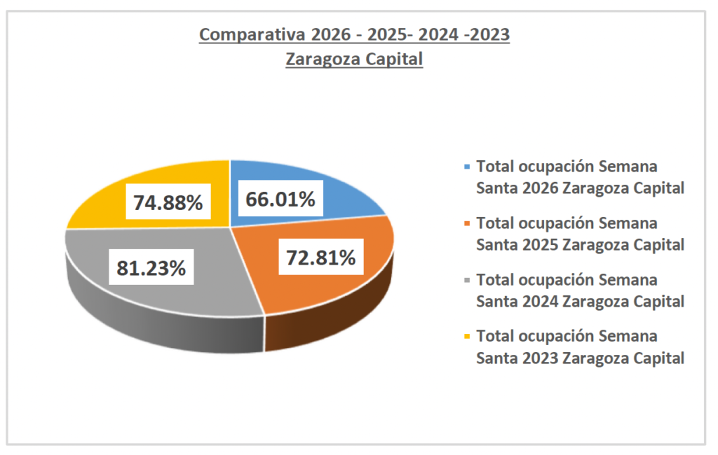 Las previsiones de ocupación hotelera de esta Semana Santa en Zaragoza descienden ligeramente con respecto a años anteriores, a pesar de los grandes atractivos, de tradición, arte, cultura y gastronomía, que ofrece la capital aragonesa en estas fiestas que son de interés turístico internacional y cuentan con más de 700 años de historia. La previsión de ocupación hotelera en Zaragoza capital se estima en un 66 % cuando en 2025 fue del 72,81 % y en 2024 alcanzó la cifra del 81,23 %. No obstante, los empresarios del sector hostelero son optimistas y confían en que los días centrales de esta Semana Santa se recupere el ritmo en las reservas de última hora y se consiga igualar o superar las cifras de ocupación de otros años.