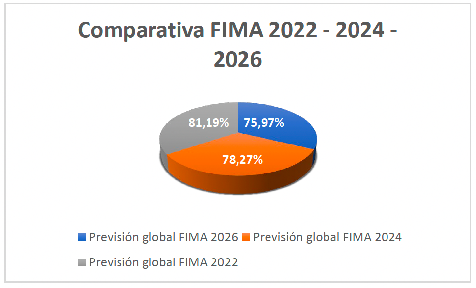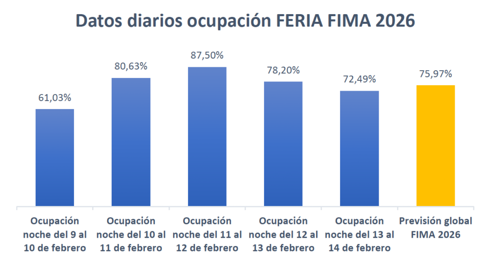 Así, la previsión global de ocupación durante los días de celebración de FIMA 2026 se sitúa por debajo de los niveles alcanzados en 2024 y 2022, una evolución que se refleja también en una reducción de la estancia media, que pasa de 2,45 días en 2022 y 2,35 días en 2024 a 2,09 días en la presente edición. Este comportamiento apunta a viajes más cortos y a una mayor concentración de las estancias en los días centrales. Así, para este año se prevé un nivel global de ocupación de casi el 76 % frente al 78 de 2024 y el 81 de 2022.