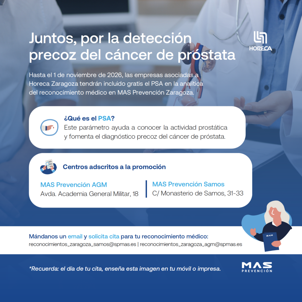MAS Prevención y Horeca Zaragoza renuevan un año más su compromiso con la salud masculina en Aragón poniendo en marcha una nueva campaña de sensibilización dirigida a fomentar la detección temprana del cáncer de próstata entre los trabajadores del sector hostelero. La acción permite que los empleados de las empresas asociadas a Horeca Zaragoza puedan realizarse, sin coste adicional, la prueba de PSA (antígeno prostático específico) dentro de sus reconocimientos médicos laborales.